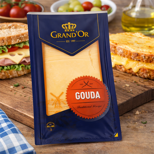 DESCRIPTION: Grand’Or Gouda Cheese 48% – 8 Slices Young (160g) is a mild, creamy Dutch-style cheese specially crafted for a smooth and delicate taste. As a young Gouda, it offers a softer texture and a gentle, slightly buttery flavor that appeals to the whole family.